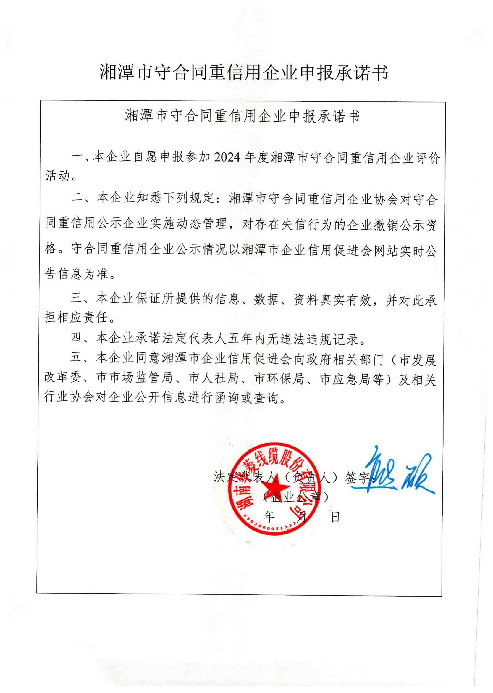 本企業(yè)根據(jù)《湘潭市守合同重信用企業(yè)申報(bào)規(guī)定》等編制 2024 年度企業(yè)信用報(bào)告書(shū),并保證本報(bào)告書(shū)內(nèi)容真實(shí)、準(zhǔn)確、完整。
