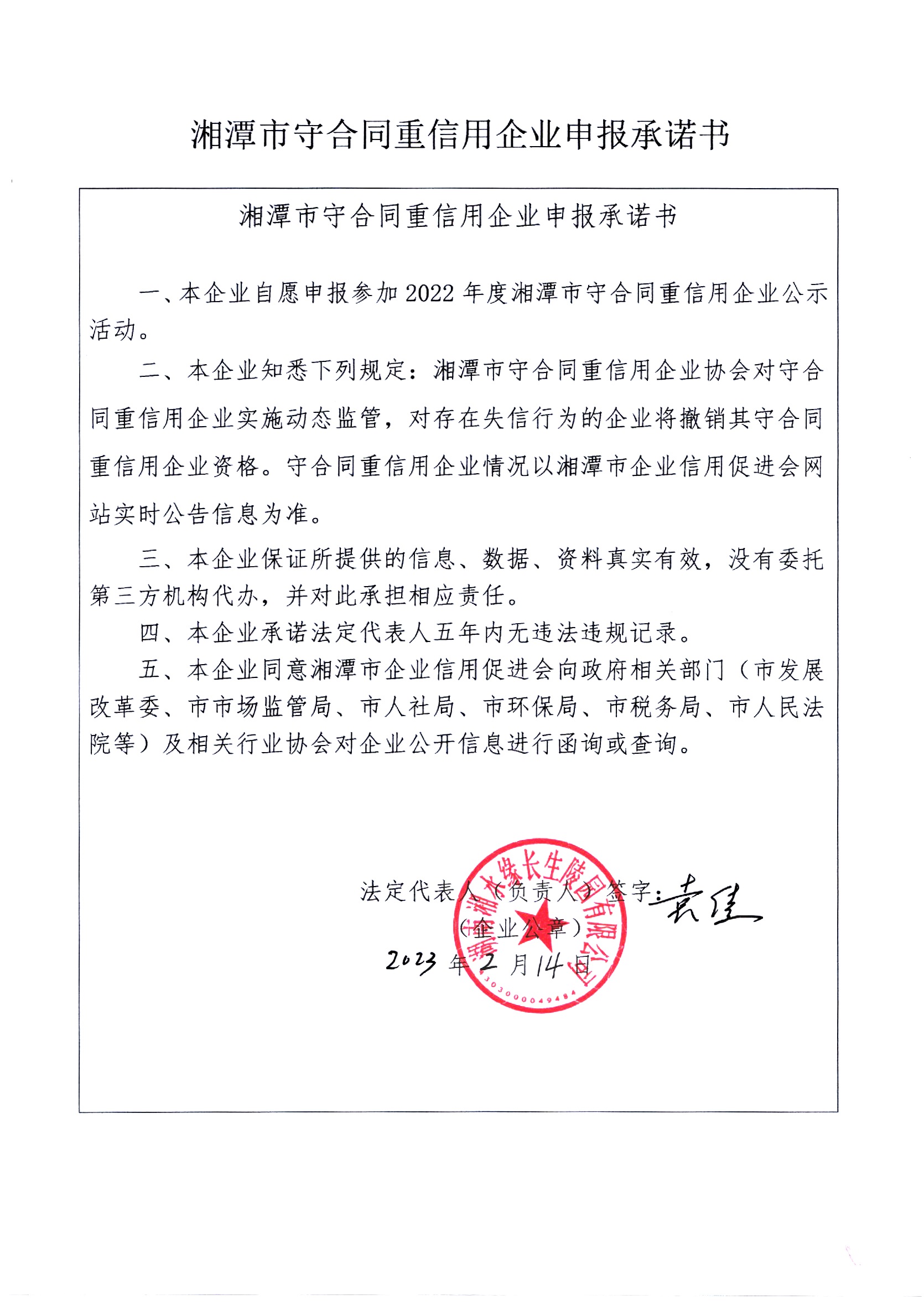 本企業(yè)根據(jù)《湘潭市守合同重信用企業(yè)申報規(guī)定》等編制 2022 年度企業(yè)信用報告書,并保證本報告書內(nèi)容真實、準確、完整。