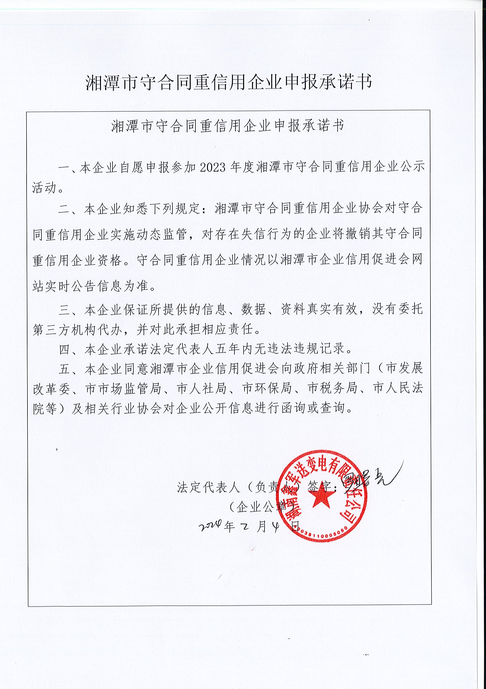 本企業(yè)根據(jù)《湘潭市守合同重信用企業(yè)申報(bào)規(guī)定》等編制 2023 年度企業(yè)信用報(bào)告書,并保證本報(bào)告書內(nèi)容真實(shí)、準(zhǔn)確、完整。