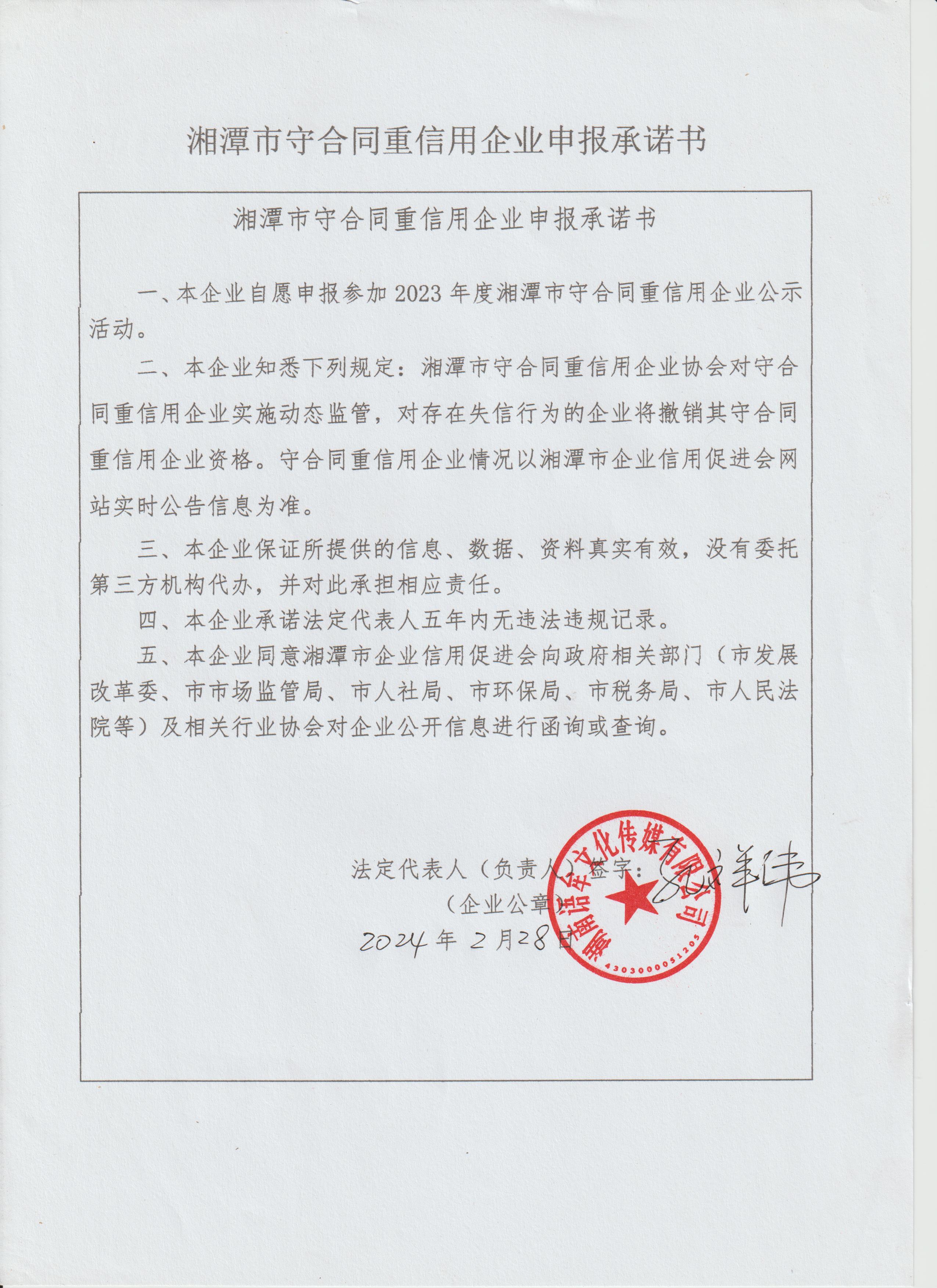 本企業(yè)根據(jù)《湘潭市守合同重信用企業(yè)申報(bào)規(guī)定》等編制 2023 年度企業(yè)信用報(bào)告書(shū),并保證本報(bào)告書(shū)內(nèi)容真實(shí)、準(zhǔn)確、完整。