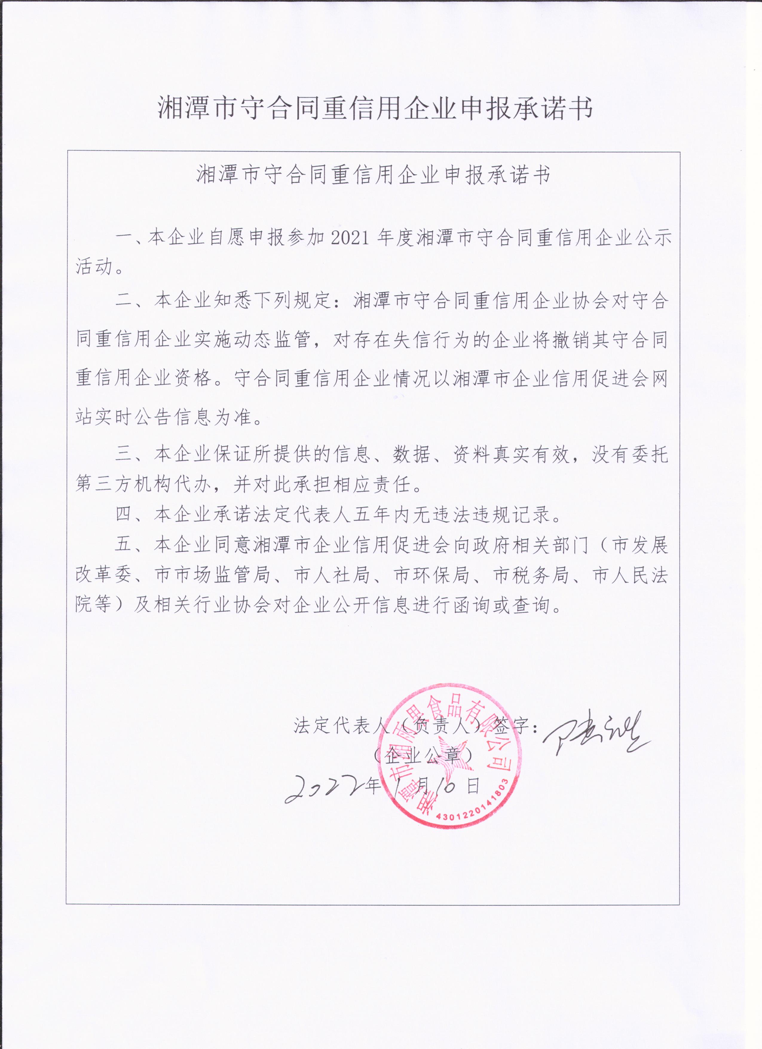 本企業(yè)根據(jù)《湘潭市守合同重信用企業(yè)申報規(guī)定》等編制 2021 年度企業(yè)信用報告書,并保證本報告書內容真實、準確、完整。